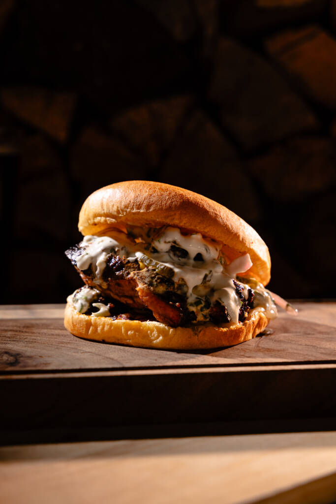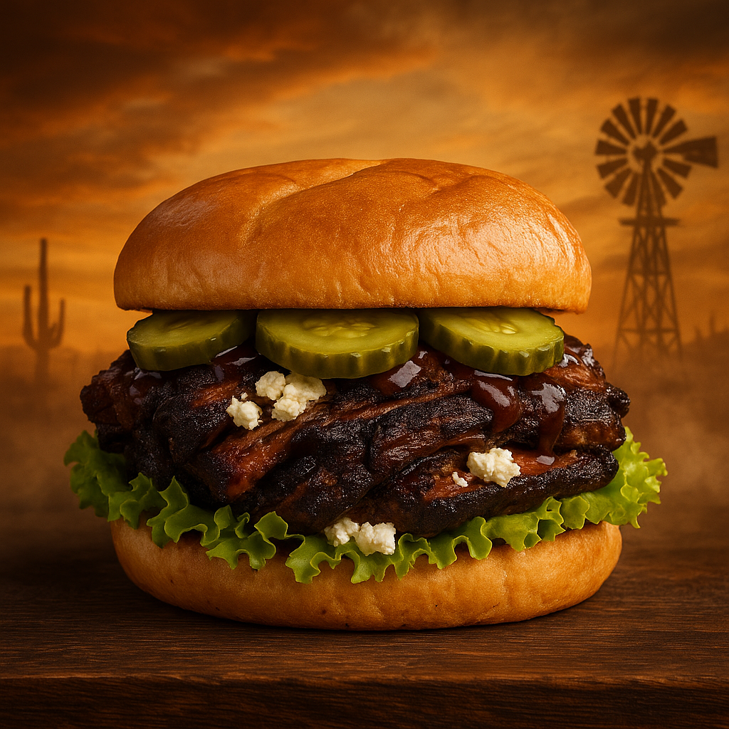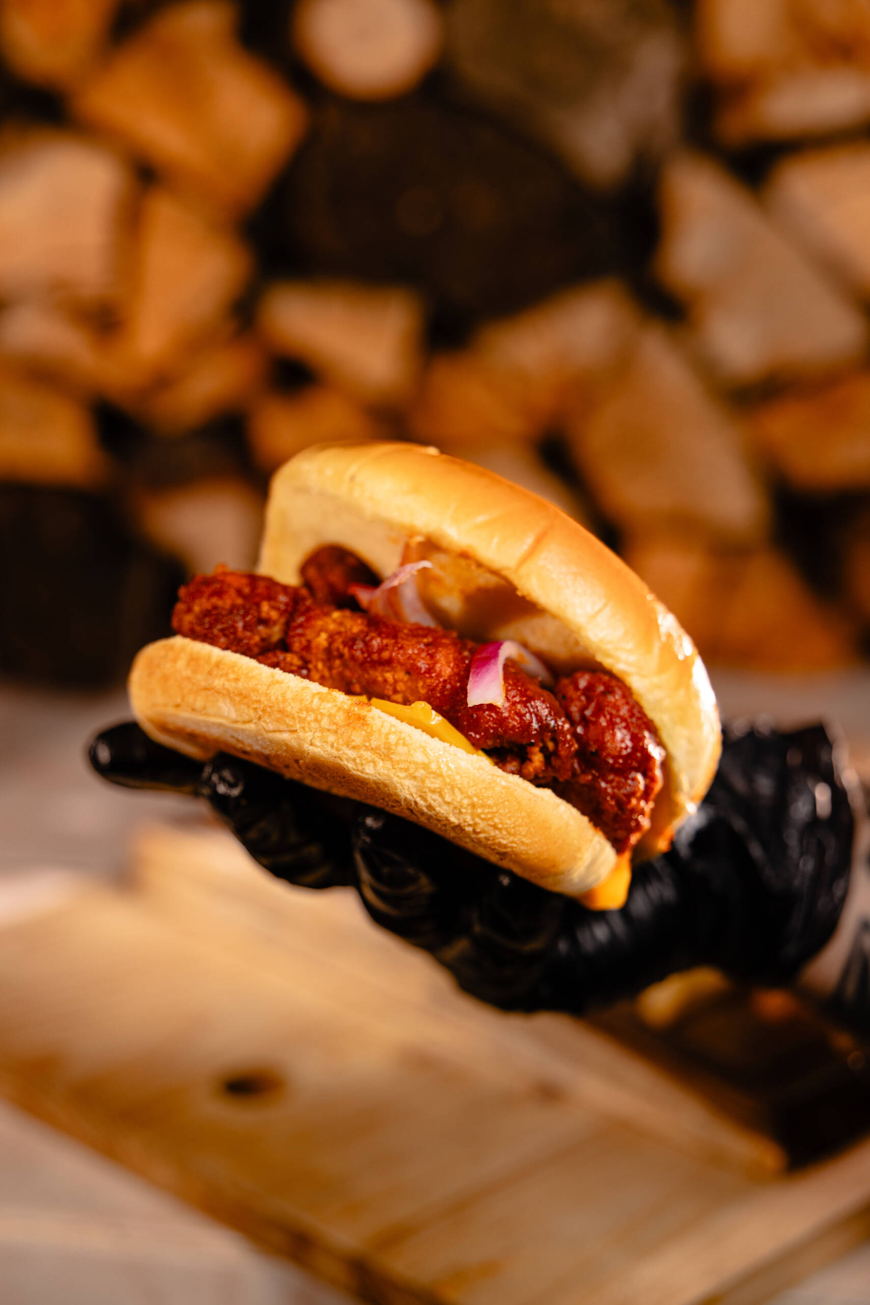 Sándwich gourmet de tiras de pollo frito y jugoso con la salsa spicy de la casa, una mezcla exclusiva de nuestra BBQ artesanal con el toque audaz de picante que eleva a este sándwich a un nivel completamente nuevo, aportando el equilibrio perfecto entre dulzura ahumada y un picor vibrante.
